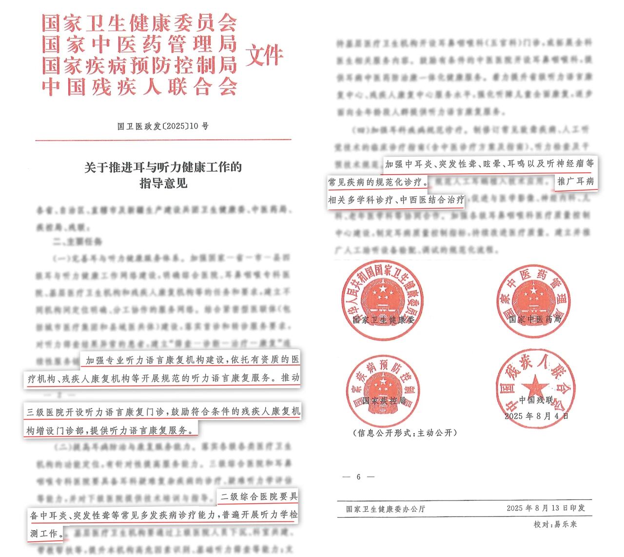《关于推进耳与听力健康工作的指导意见》。文件提出,要加强听力康复机构建设,提升突聋、耳鸣等常见疾病的诊疗水平,推广中西医结合模式,逐步完善从筛查、诊断到康复的连续性服务体系。