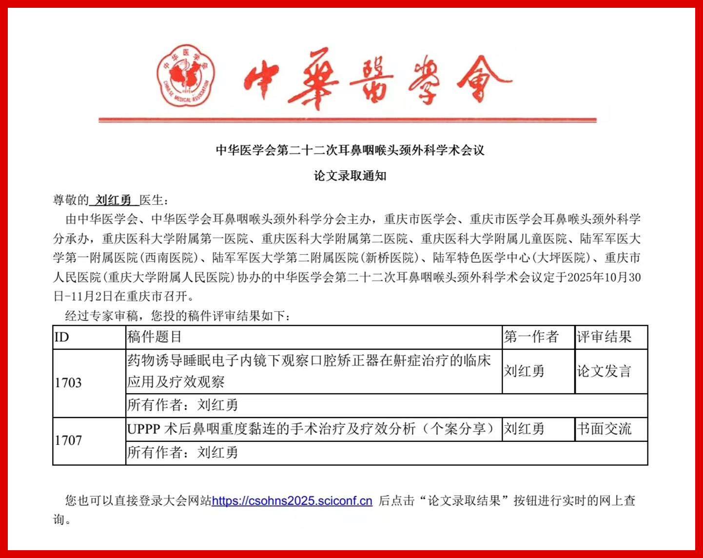6篇论文成功入选中华医学会第二十二次耳鼻咽喉头颈外科学术会议,全部通过专家严格评审,取得