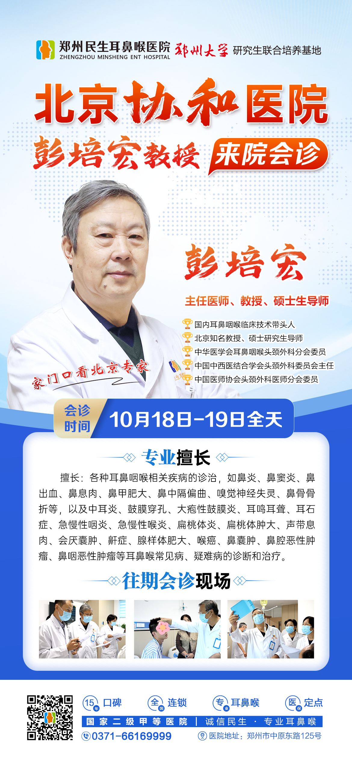 10月18—19日,北京协和医院耳鼻喉专家彭培宏教授将亲临郑州民生耳鼻喉医院,为郑州及周边患者提供专业、精准的诊疗服务,帮助更多耳鼻喉患者在入秋时节及时防治、科学调养!