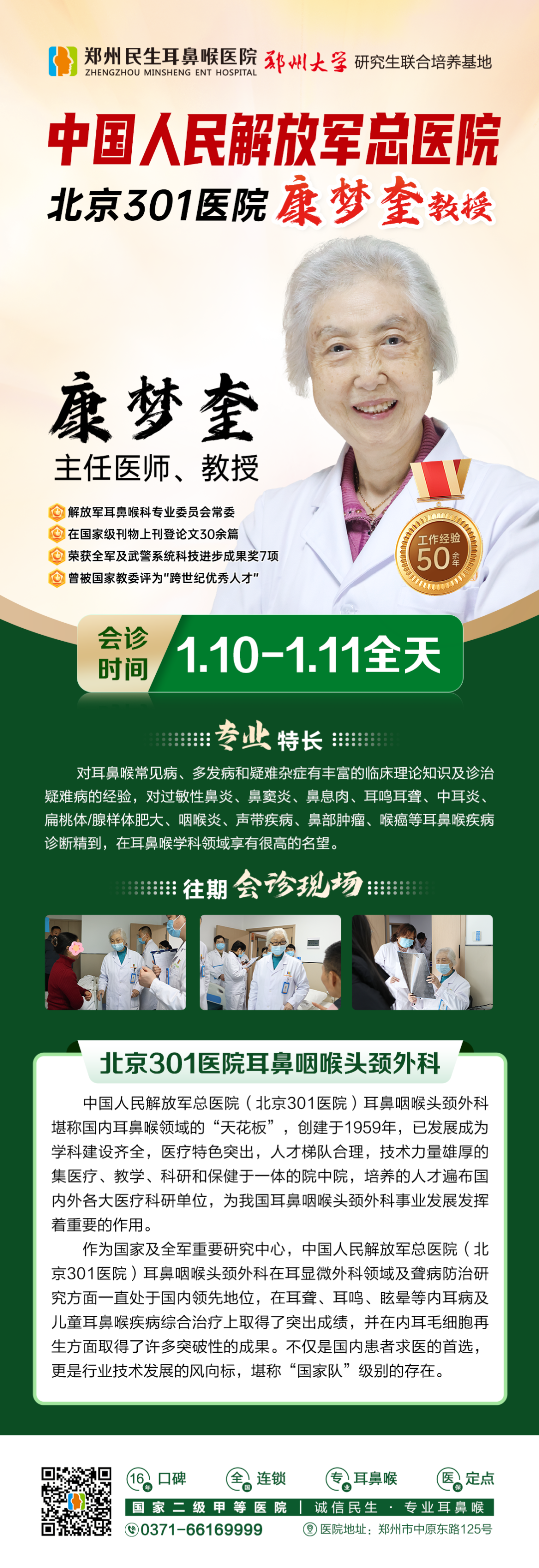 1月10-11日(周六、周日)全天,北京301医院康梦奎教授亲临郑州民生耳鼻喉医院,开展